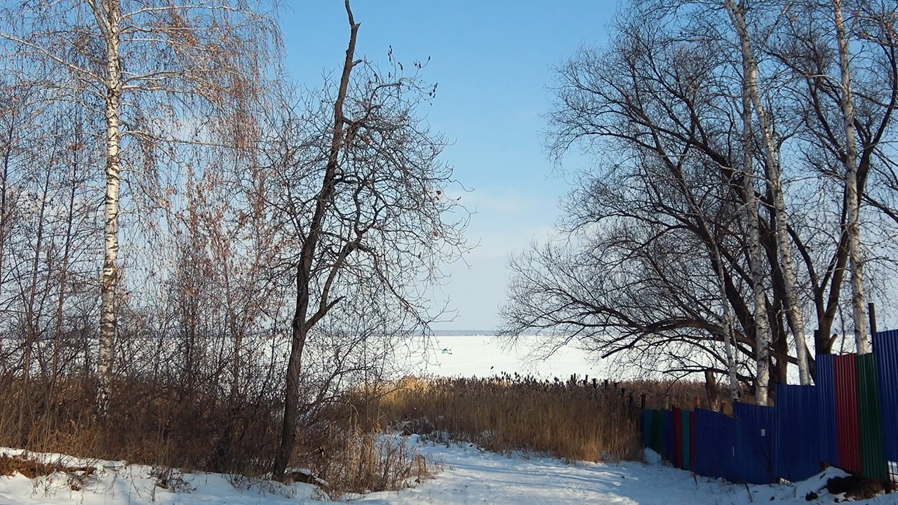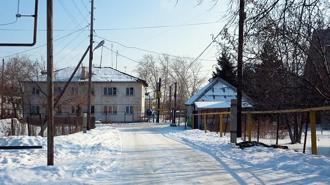 Напротив ворот, через дорогу — проржавевшее ограждение из дырявой сетки-рабицы. Протоптанная в снегу тропинка ведет вниз по спуску к озеру Сугояк. Метрах в пятистах от берега на льду стоят палатки рыбаков.