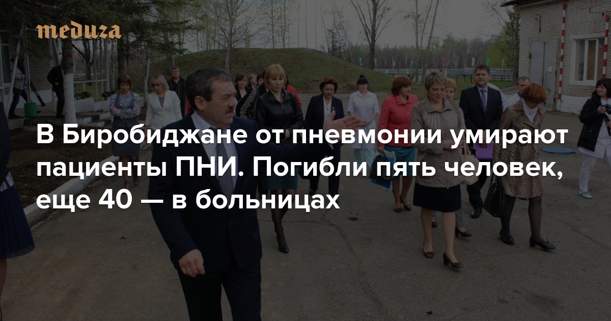 В Биробиджане с середины марта от пневмонии умерли пятеро пациентов психоневрологического диспансера. Еще 13 человек из биробиджанского ПНИ находятся в областной больнице с пневмонией. 27 пациентов поместили инфекционную больницу, у девяти из них грипп. Местные СМИ начали писать о большом количестве погибших от пневмонии 23 марта. Затем стало известно о еще одном погибшем в ПНИ человеке, 91-летней женщине. Ее смерть связывают с последствиями инсульта, пневмонией она не болела. Женщина умерла на территории ПНИ, все остальные скончались в областной больнице, куда попали в тяжелом состоянии.