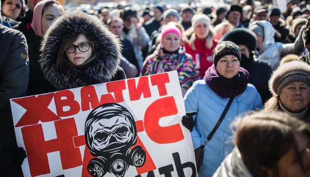 «Перед угрозой отравления наши взгляды не имеют никакого значения, мы здесь все вместе», — заявляет Любимов. Рядом с ним стоит Роман Моисеев, бывший сотрудник районной администрации и член «Единой России». Через полминуты подтягивается еще один участник протестной коалиции — глава местного отделения ЛДПР Иувеналий Белан. Он рассказывает, что его ребенок пострадал при последнем выбросе вредных веществ: «В больницу мы не пошли, но он задыхался, и его тошнило, как и меня».