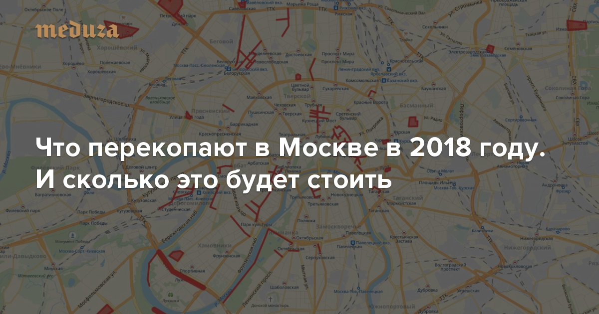 Как сказал прошлым летом вице-мэр Петр Бирюков, перекапывать улицы в Москве не закончат никогда. В 2018 году программа «Моя улица» продолжится по всему городу (включая территории за Третьим транспортным кольцом и за МКАД). В связи с чемпионатом мира по футболу масштаб работ будет меньше, чем раньше, однако проходить они будут более интенсивно. Спецкор «Медузы» Иван Голунов выяснил, что именно будут благоустраивать в Москве в этом году и сколько это будет стоить городскому бюджету.