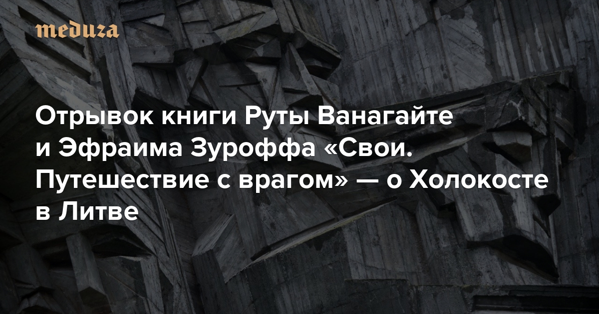 В мае в издательстве Corpus выходит книга «Свои. Путешествие с врагом», написанная в соавторстве литовской журналисткой Рутой Ванагайте и израильским историком, исследователем Холокоста Эфраимом Зуроффом, известным активным участием в розыске нацистских преступников. Ванагайте и Зурофф в 2015 году вместе совершили путешествие по городам и поселкам Литвы, где во время Второй мировой войны расстреливали местных евреев. Всего в стране зафиксировано 227 мест массовых убийств: с 1941-го по 1944-й там погибли около 200 тысяч человек. Авторы книги поговорили со свидетелями и историками, нашли документы и показания тех, кто участвовал в расстрелах, — чтобы осмыслить роль местного населения в уничтожении литовских евреев. С разрешения издательства «Медуза» публикует фрагмент книги. Перевод с литовского Александры Васильковой.