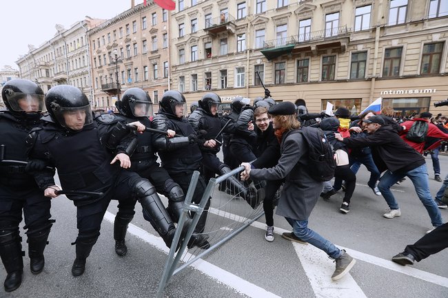 Вскоре три-четыре тысячи митингующих достигли Невского проспекта — и вышли прямо на проезжую часть, фактически ее перекрыв. Впрочем, движение на центральной улице Петербурга уже было блокировано — несколько дней назад на нескольких ее участках начали менять асфальт, объявив, что это происходит в преддверии чемпионата мира по футболу. Вдоль тротуаров по такому случаю были выставлены пластиковые и металлические ограждения — люди в авангарде колонны протестующих начали их опрокидывать; к ним вскоре присоединились и другие сторонники.
