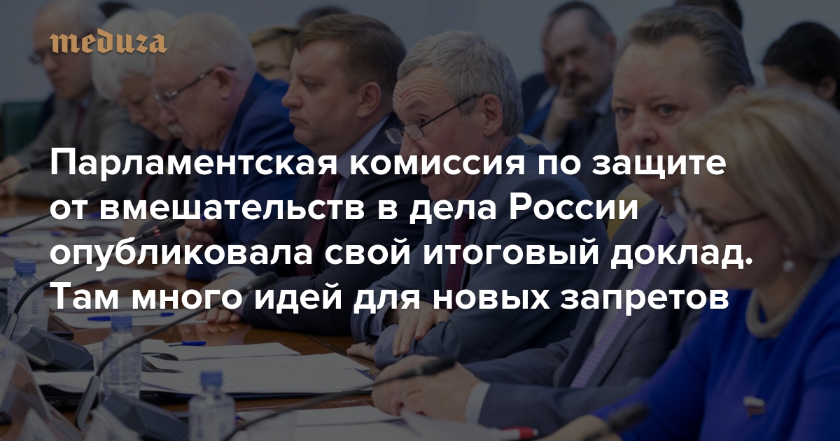 Комиссия Совета Федерации по защите России от вмешательства во внутренние дела опубликовала итоговый доклад о своей работе. В этом документе оказались законодательные предложения, которые уже упоминались в мартовском докладе, но тогда не были раскрыты, поскольку члены комиссии решили дождаться окончания президентских выборов. Комиссия, основываясь на не очень убедительных доказательствах, утверждает, что России постоянно вредит «группировка прозападных стран во главе с США», разными хитрыми способами нарушая стабильность в государстве — с помощью неправительственных организаций и послушных СМИ (упоминалась и «Медуза»). В конце документа авторы предлагают ввести много новых запретов. Вот они.