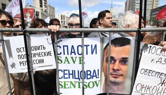 Режиссер Аскольд Куров, который снял фильм «Процесс» об Олеге Сенцове, рассказал, что видел его совсем недавно. «Он не собирается вступать с властью в диалог. Он требует только исполнения его условия — отпустить всех политзаключенных. Еще он передает привет всем, кто его не забывает и поддерживает», — сказал Куров. Он говорил негромко. Во время его выступления в толпе громко обсуждали свою проблему дольщики, которых обанкротившийся застройщик «оставил без шиша в кармане». Их попросили говорить потише. «Мы против беспредела застройщиков! Мы против беспределов застройщиков!» — дружно начали скандировать в ответ мужчины с зелеными плакатами с надписью «Донской».