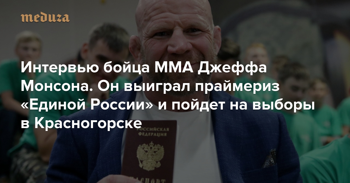 Боец смешанных единоборств Джефф Монсон стал победителем праймериз «Единой России» в подмосковном Красногорске — и теперь может баллотироваться в горсовет этого города. В мае 2018 года боец, известный своей любовью к России и, в особенности, к ее советскому прошлому, получил российский паспорт и отказался от гражданства США. После этого он открыл в Красногорске школу боевых искусств. Политические амбиции бойца уже публично поддержал губернатор Московской области Андрей Воробьев. Джефф Монсон объяснил «Медузе», зачем ему все это нужно.