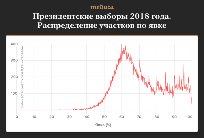 На этом графике видно, что больше всего участков с явкой примерно 62%, но распределение довольно широкое: попадаются участки с явкой от 40 до 100%. Бросающаяся в глаза особенность этого графика — узкие пики на высоких значениях явки. Самые высокие пики находятся на круглых значениях явки (70%, 80%, 90%), пики поменьше хорошо видны на целых значениях (например, 91,0%, 92,0%, 93,0% и т. д.). Это означает, что участков с целой явкой (например, 93,0%) значительно больше, чем с нецелой (92,9% или 93,1%).