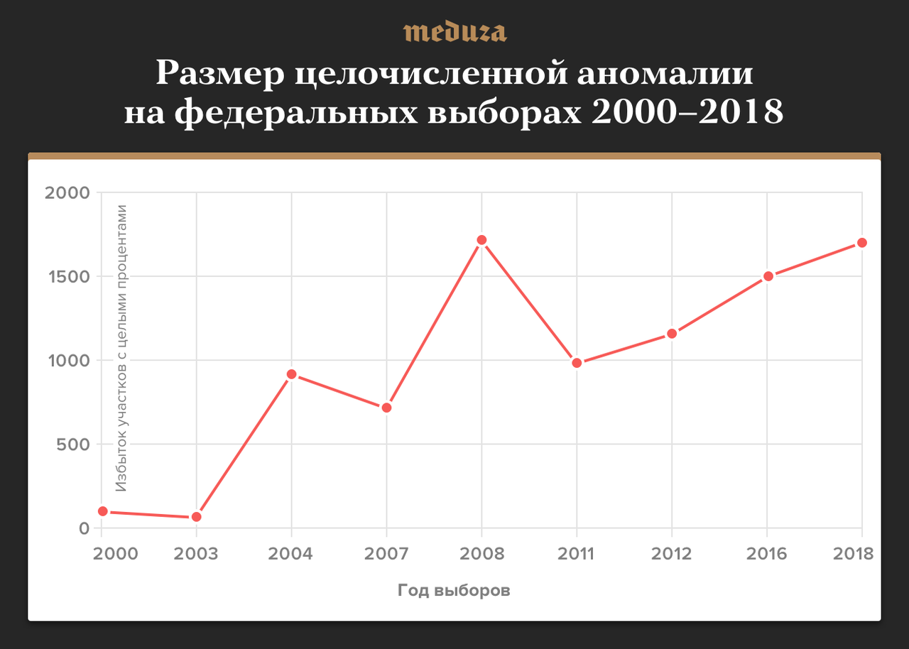 В 2000 и 2003 годах аномалия близка к нулю — целочисленных пиков тогда не было (а фальсификации, по-видимому, были минимальны). В 2004-м аномалия резко подскочила до 1000 участков, в 2008-м достигла 1750 участков (почти 2% от их общего числа) — и в 2018-м снова вернулась на этот рекордный уровень.