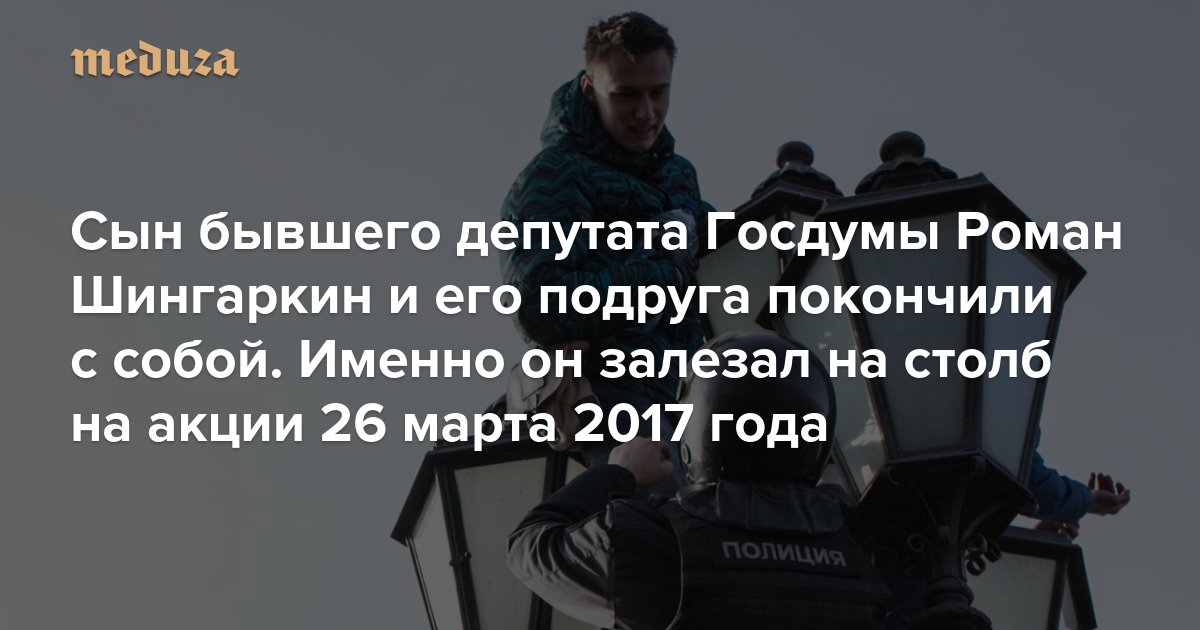 Сын бывшего депутата Госдумы Роман Шингаркин и его подруга покончили с собой. Именно он залезал на столб во время антикоррупционной акции 26 марта 2017 года