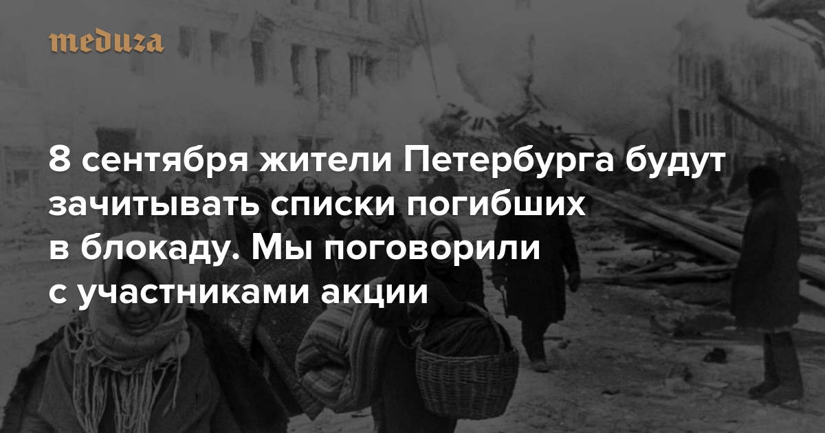 8 сентября — в день начала блокады Ленинграда — в Санкт-Петербурге пройдет акция памяти погибших в блокадные годы: в домах, учреждениях и на площадях, в Эрмитаже, Русском музее, университетах и районных школах все желающие будут называть имена и адреса людей, которые умерли в городе в 1941–1944 годах. Придумал акцию «Комитет 8 сентября», который возглавляет историк и публицист Лев Лурье; организаторы надеются, что она станет ежегодной. Некоторые жители Петербурга обратились к «Комитету» с предложением самостоятельно организовать чтения списков погибших в своих домах и дворах. «Медуза» записала рассказы таких людей.
