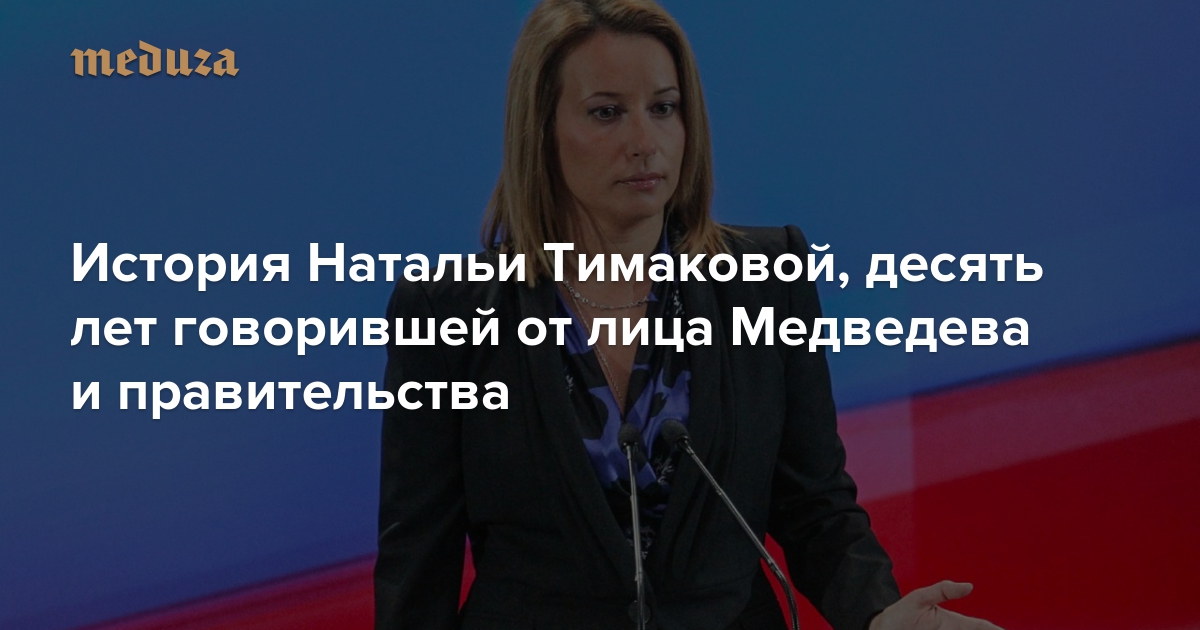 Пресс-секретарь Дмитрия Медведева Наталья Тимакова 17 сентября уволилась и перешла на работу во Внешэкономбанк. За 19 лет на госслужбе бывшая журналистка успела побывать «говорящей головой» Владимира Путина (она должна была оттенять «брутального» премьера, но продержалась на посту всего около месяца); победить вместе с Медведевым на «праймериз преемников» Сергея Иванова; вступить в конфликт с движением «Наши» и Владиславом Сурковым; стать героем историй про либеральный «заговор медведевцев» и невольным автором нескольких мемов. Спецкор «Медузы» Таисия Бекбулатова поговорила с Тимаковой, а также работавшими с нею журналистами и чиновниками — и рассказала ее историю.