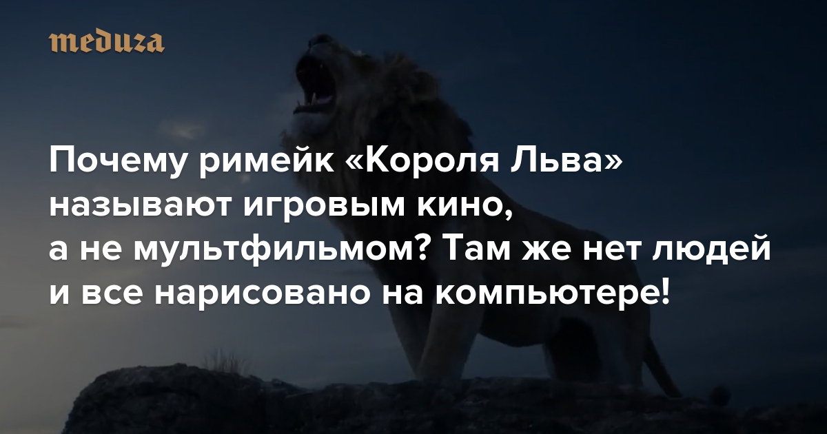В ноябре компания Disney выпустила первый тизер-трейлер римейка «Короля Льва», снятого режиссером Джоном Фавро («Железный человек»). Главные роли в новой версии сыграли Дональд Гловер (он же — рэпер Чайлдиш Гамбино), Сет Роген («Соседи»), Чиветель Эджиофор («12 лет рабства»), Джеймс Эрл Джонс (голос Дарта Вейдера в «Звездных войнах») и певица Бейонсе. Несмотря на то, что все герои картины нарисованы на компьютере, перезапуск называют игровым кино, а не анимационным — и это только путает многих зрителей. «Медуза» объясняет, чем новый «Король Лев» отличается от обычного мультфильма.