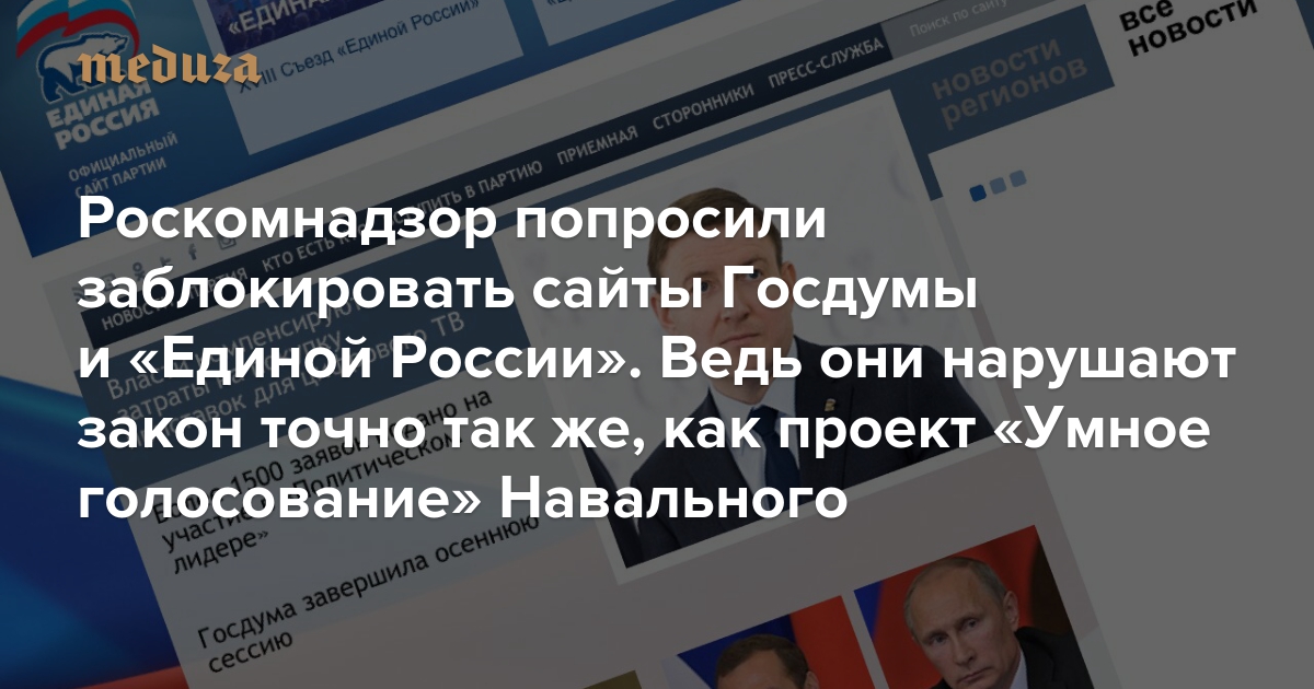 Роскомнадзор попросили заблокировать сайты Госдумы и «Единой России». Ведь они нарушают закон точно так же, как проект «Умное голосование» Навального