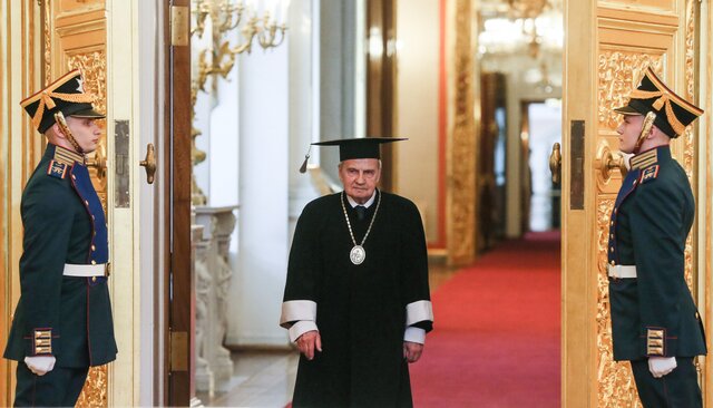 Во время каждой инаугурации в глубине сцены, по правую руку от президента, стоит фигура в черной мантии, которая должна символизировать законность происходящего. По протоколу церемонии, глава Конституционного суда просит избранного президента принести присягу на Конституции, после чего объявляет его вступившим в должность. 75-летний Валерий Зорькин делал это уже четыре раза.