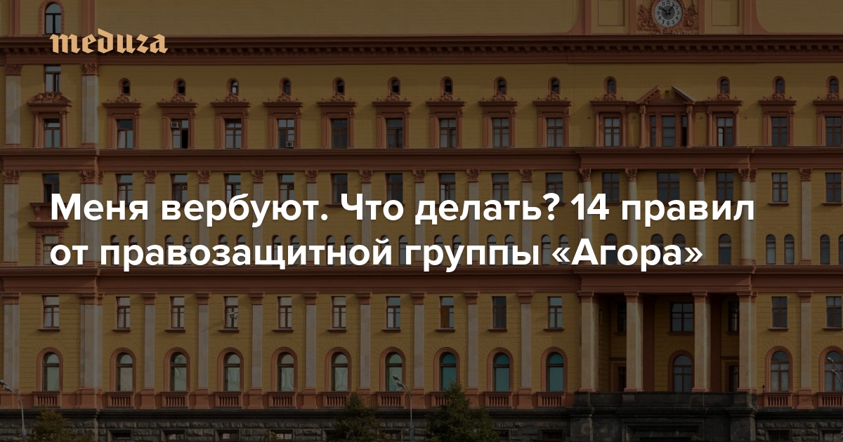 28 января офис-менеджер Фонда борьбы с коррупцией Ольга Булаева рассказала, как ее пытались завербовать сотрудники правоохранительных органов. Они силой завели ее в подсобное помещение метро, отняли телефон и предложили сотрудничать, пообещав помочь с деньгами и лечением больной матери. «Медуза» публикует 14 правил о том, как себя вести, если вас пытаются завербовать МВД и ФСБ, — их составили юристы правозащитной группы «Агора».