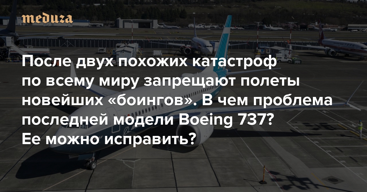 12 марта большинство авиакомпаний по всему миру и целые страны (от Китая до Евросоюза) приостановили полеты новейших самолетов Boeing 737 MAX; остановила эксплуатацию и российская S7, у которой — единственной в стране — есть два самолета этой модификации. Причина запретов — вторая за полгода катастрофа нового лайнера, который Boeing начала поставлять всего два года назад. Утром 10 марта самолет авиакомпании Ethiopian Airlines упал сразу после взлета из аэропорта Аддис-Абебы; на борту находились 8 членов экипажа и 149 пассажиров, в том числе трое россиян. «Медуза» рассказывает, как на новом самолете появилась незнакомая пилотам система и почему Boeing за полгода ее не поправила.