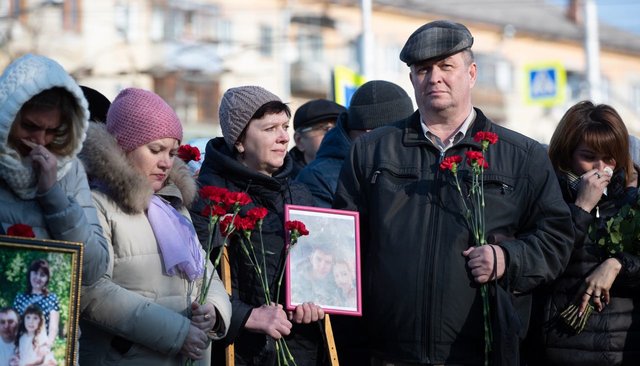 На площади дежурят врачи и студенты-волонтеры, в руках у них бумажные салфетки и стаканы с газированной водой. И то, и другое приходится кстати. Кто-то из родственников подходит к мемориалу молча, кто-то начинает плакать. Видно, что родные погибших поддерживают друг друга, но при этом почти не общаются между собой, а уж тем более с посторонними — горожанами или журналистами.