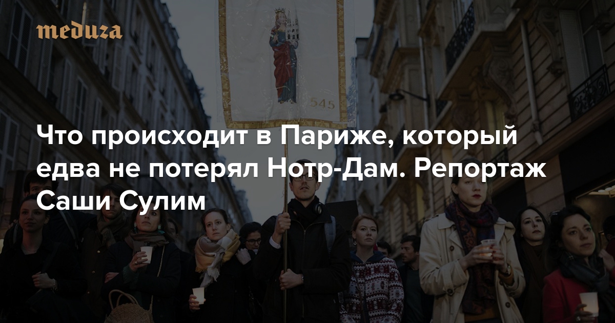 В соборе Парижской Богоматери — главной католической святыне Франции и одном из самых известных готических храмов Европы — 15 апреля произошел сильный пожар. Большую часть крыши здания и шпиль, построенный в XIX веке, спасти не удалось, но башни и стены выстояли. На следующий день на набережных и мостах вблизи Нотр-Дама собрались сотни людей; в основном они фотографировали собор — а вечером на площади напротив прошло католическое молитвенное бдение, которое объединило около тысячи человек. Спецкор «Медузы» Саша Сулим отправилась в Париж, чтобы понять, как горожане переживают случившееся, — и обнаружила, что местная жизнь как будто вернулась в обычный ритм, однако боль утраты будет ощущаться тут еще очень долго.