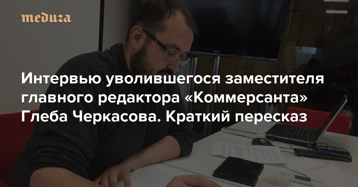 В мае из «Коммерсанта» вынужденно ушли журналист Иван Сафронов и редактор Максим Иванов. По их словам, на увольнении настоял владелец издания Алишер Усманов из-за статьи о возможной отставке спикера Совета Федерации Валентины Матвиенко. В знак протеста об уходе объявил весь отдел политики «Коммерсанта». Заявления написали 11 человек, в том числе заместитель главного редактора Глеб Черкасов. Он рассказал об уходе из «Коммерсанта» спецкору «Новой газеты» Илье Азару. «Медуза» кратко пересказывает это интервью. Цитаты Черкасова приведены в кавычках.