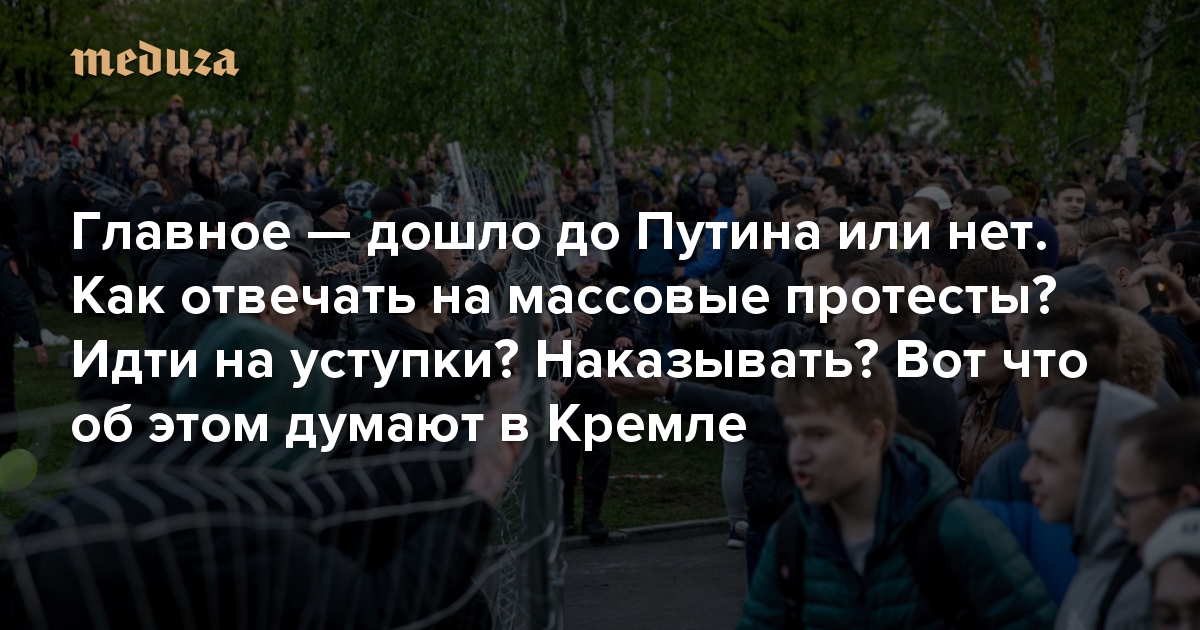 «Система оценки протестов и работы с ними у Кремля не менялась еще, наверное, со времен [первого российского президента Бориса] Ельцина», — утверждает в беседе с «Медузой» один из бывших сотрудников администрации президента (АП). Он работал в Кремле еще в тот период, когда куратором внутренней политики в стране был Владислав Сурков. Как и раньше, любая протестная акция в России получает статус «протеста номер один» для чиновников администрации, как только о ней узнает президент. «Это первое и главное для определения статуса протеста — дошло до ушей Путина или нет», — говорит собеседник «Медузы».