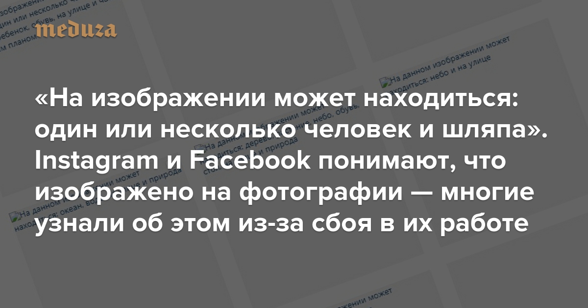 Пользователи Facebook и принадлежащих ему Instagram и WhatsApp 3 июля столкнулись со сбоями в работе сервисов. В случае с Facebook и Instagram неполадки привели к необычному эффекту. Вместо фотографий соцсеть показывала серые квадраты с довольно точными текстовыми описаниями изображений. То есть в том виде, в каком алгоритмы сервисов благодаря машинному анализу воспринимают пользовательские снимки.