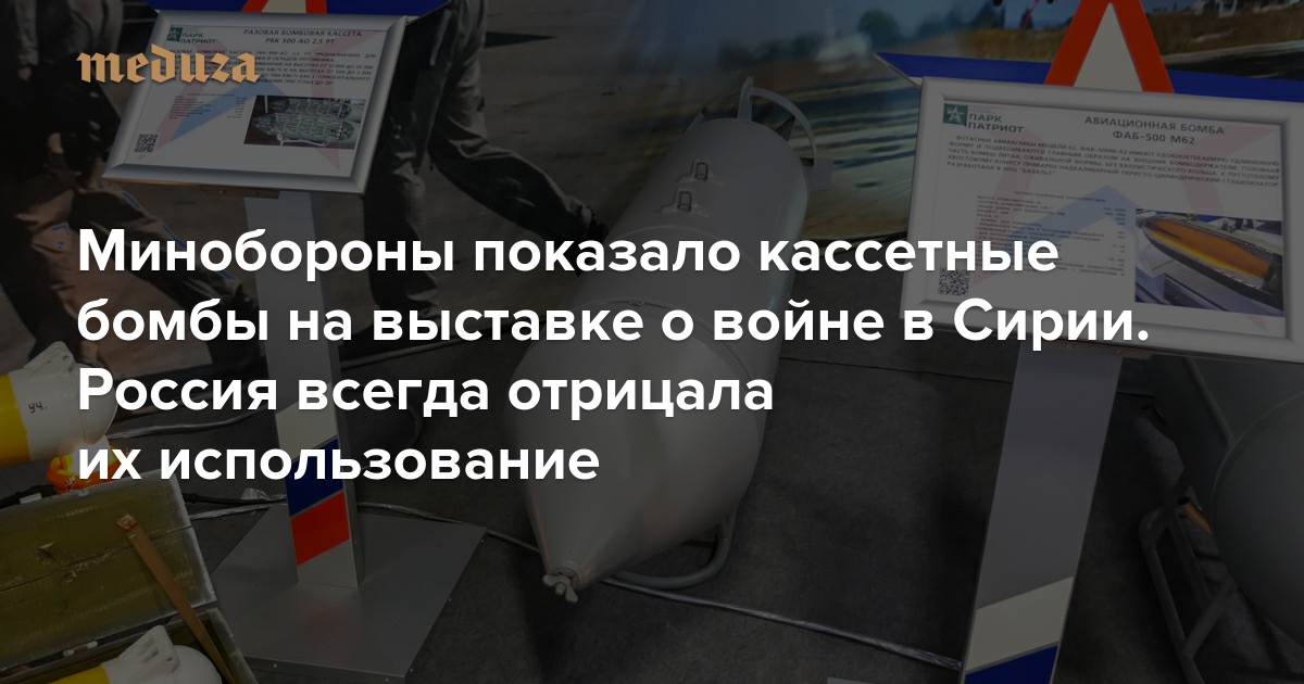 Министерство обороны РФ показало на выставке в подмосковном военно-патриотическом парке «Патриот» кассетные бомбы, которые, предположительно, использовали во время войны в Сирии. Об этом говорится в расследовании российской исследовательской группы Conflict Intelligence Team, участники которой посетили выставку.