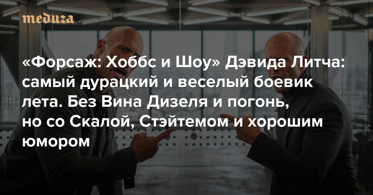 1 августа в российских кинотеатрах вышел боевик Дэвида Литча «Форсаж: Хоббс и Шоу». В спин-оффе франшизы со злом борются бывшие противники — американский и британский спецагенты Люк Хоббс (Дуэйн «Скала» Джонсон) и Деккард Шоу (Джейсон Стэйтем). Кинокритик «Медузы» Антон Долин рассказывает, как фильм обходится без Вина Дизеля и бесконечных погонь и почему издевательски глупый боевик может стать достойным августовским развлечением.