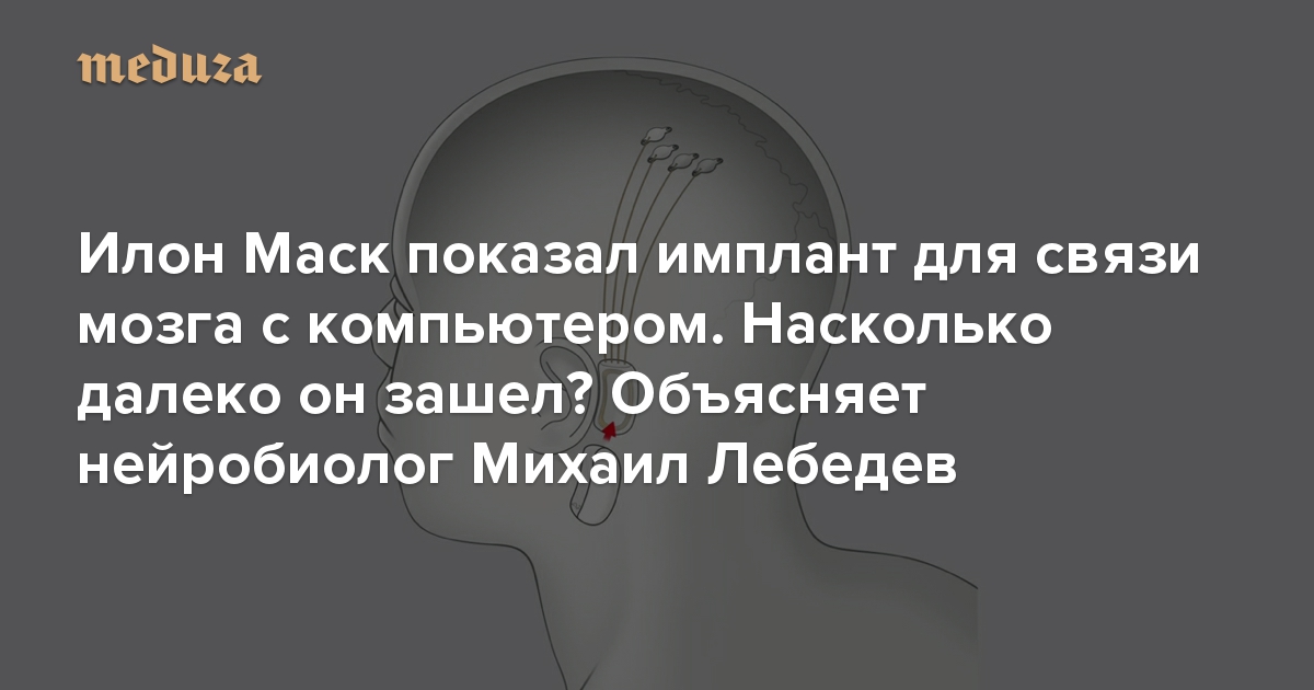 Этим летом на большой презентации в Калифорнии Илон Маск показал прототип устройства, которое в течение двух лет за закрытыми дверями разрабатывала основанная предпринимателем компания Neuralink. Это устройство внедряется в мозг и способно передавать информацию о его активности в компьютер и обратно. Маск раскрыл немало технических подробностей, но многое осталось неясным: что по-настоящему нового придумали специалисты, как компания собирается зарабатывать, что получат пациенты с болезнями Паркинсона и Альцгеймера. «Медуза» поговорила об этом с Михаилом Лебедевым — нейробиологом, который не только много лет занимается созданием и исследованием подобных устройств на обезьянах, но и человеком, из лаборатории которого вышли некоторые сотрудники компании Neuralink, даже ее президент Макс Ходак.