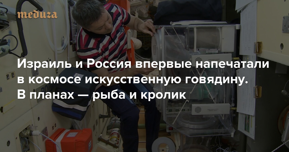 Израильская компания Aleph Farms и российская частная лаборатория 3D Bioprinting Solutions провели успешный эксперимент на Международной космической станции: с помощью российского биопринтера клетки мышечной ткани коровы были собраны в небольшой кусок мяса (его размер не указывается). Российская лаборатория планирует продолжить проект — будут напечатаны ткани рыбы и кролика, клеточный материал для которых предоставили другие компании. У эксперимента двойная цель: сделать производство продовольствия на Земле более экологичным, а также обеспечить питанием тех, кто покинет планету.
