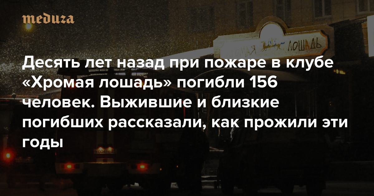 В час ночи 5 декабря 2009 года в ночном клубе «Хромая лошадь» в центре Перми произошел пожар. Источником огня был фейерверк, который устроили прямо в зале клуба. Из-за пиротехники загорелись пластиковые и пенопластовые элементы декора — помещение без окон заполнил токсичный дым. Отравление им стало причиной большинства смертей посетителей клуба: всего погибли 156 человек, еще несколько десятков пострадали. Пожар в «Хромой лошади остается одной из самых серьезных трагедий такого рода в истории России. Близкие погибших и те, кому удалось выжить, рассказали «Медузе», как прожили последние десять лет.