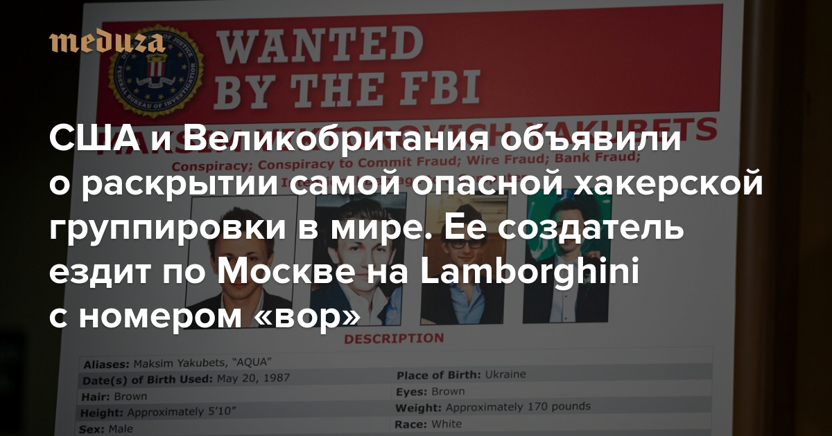 Правоохранительные органы США и Великобритании объявили о раскрытии самой опасной в мире хакерской группировки под названием Evil Corp: ее хакеры работают из московских кафе, а руководит ею москвич Максим Якубец, который ездит на люксовом Lamborghini с надписью «вор» на номерном знаке. За десять лет группировка похитила у граждан и организаций из США и Великобритании сотни миллионов долларов, заявили ведомства. За помощь в поимке Якубца США назначили рекордное для киберпреступника вознаграждение в 5 миллионов долларов.