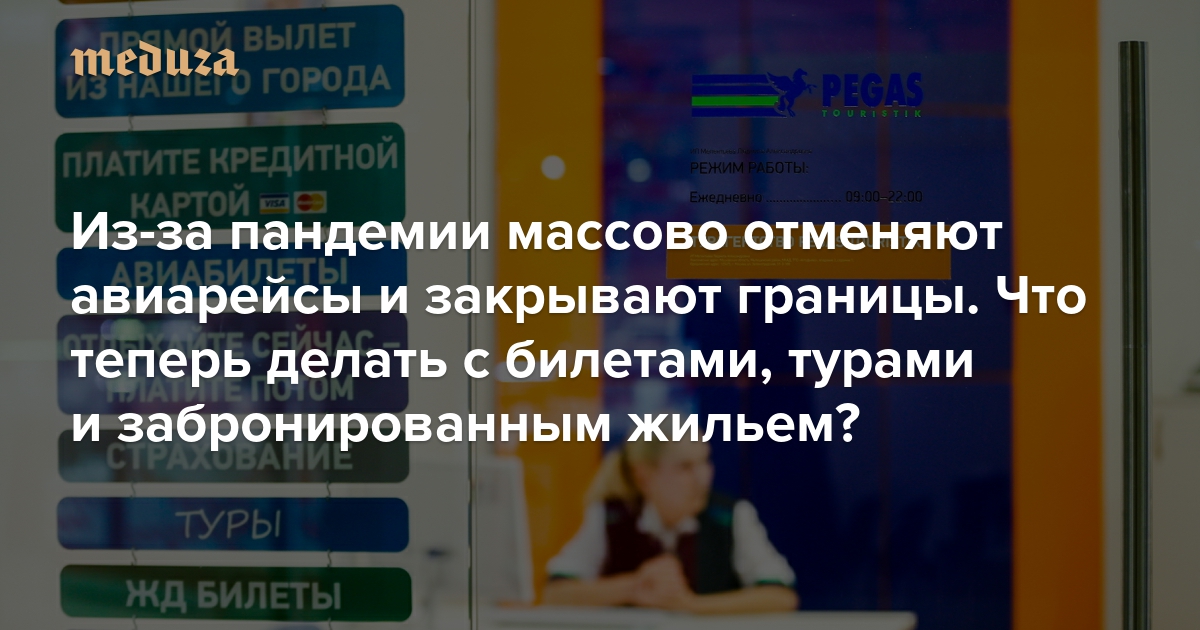 Из-за пандемии коронавируса российские и международные авиакомпании отменяют все больше рейсов, а власти разных стран, включая Россию, вводят все новые ограничения на путешествия. Всемирная организация здравоохранения только что официально объявила о пандемии, так что все это надолго. «Медуза» выяснила у туроператоров, авиакомпаний и билетных агрегаторов, как теперь быть тем, кто уже купил билеты (или туры) и забронировал жилье.