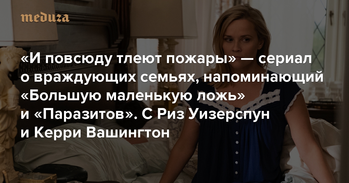 Что это за сообщение и почему оно повсюду на «Медузе»?На сервисах Hulu и ivi вышли первые эпизоды мини-сериала «И повсюду тлеют пожары» — провокационной драмы об отношениях между двумя непохожими семьями в идеальном американском пригороде конца 1990-х. Главные звезды и одновременно продюсеры сериала — актрисы Риз Уизерспун и Керри Вашингтон. Кинокритик Егор Москвитин рассказывает о шоу, которое одновременно напоминает и «Большую маленькую ложь», и «Паразитов».