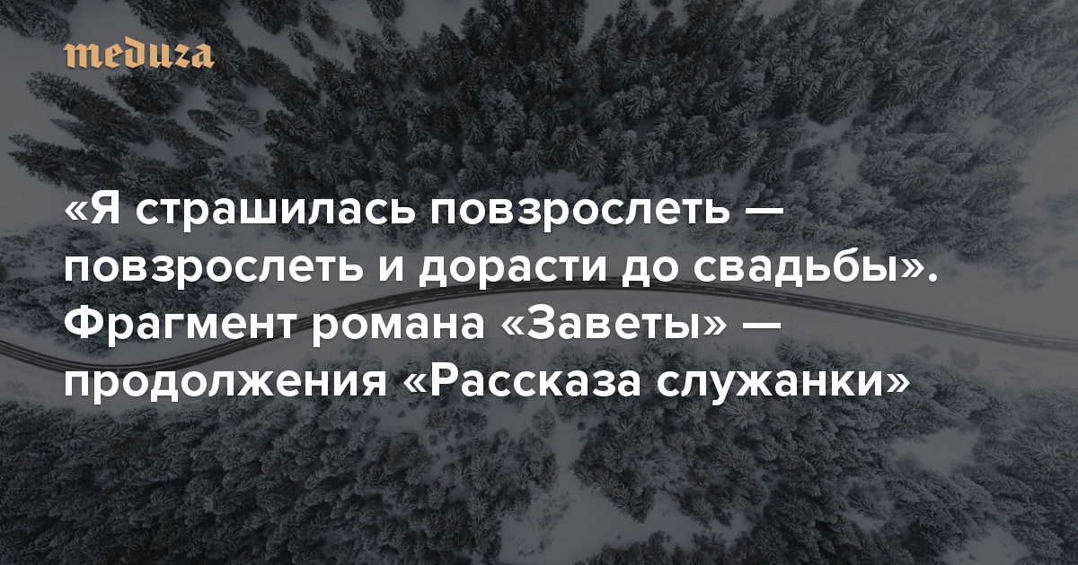 В издательстве «Эксмо» выходит роман канадской писательницы Маргарет Этвуд «Заветы» (перевод Анастасии Грызуновой). Это продолжение «Рассказа служанки», опубликованное спустя 34 года после первой части. В 2019 году Этвуд получила за «Заветы» Букеровскую премию по литературе. События романа происходят через пятнадцать лет после «Рассказа служанки». Главные героини — Тетка Лидия, девушка из Галаада Агнес и Дейзи, живущая в Канаде. С разрешения издательства «Медуза» публикует фрагмент романа, в котором одна из героинь вспоминает свое детство, проведенное в Галааде.