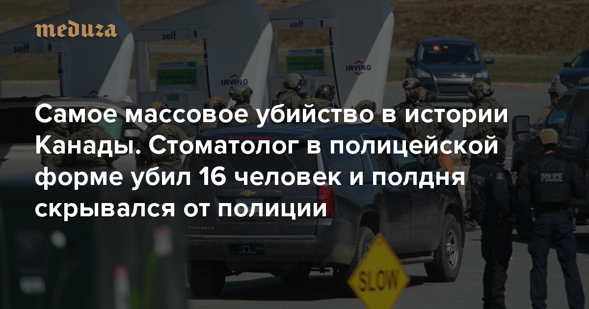 В канадской провинции Новая Шотландия убиты 16 человек. Около 22 часов 18 апреля 51-летний стоматолог Гэбриел Уортман, одетый в форму полиции, застрелил несколько человек в небольшом городе Портапик (100 километров от Галифакса, административного центра провинции). Полицейские нашли тела погибших в одном из домов и возле него. По данным полиции, это было первое место преступления, затем последовали еще несколько нападений — они были совершены на расстоянии не менее 50 километров друг от друга. «Серьезное преступление» произошло в деревне Шубенакади, отметили в полиции. Очевидцы рассказали, что видели там горящую полицейскую машину. Жители провинции также сообщили, что в нескольких домах произошли пожары. По словам очевидцев, Уортман поджег свой дом и несколько других зданий, а затем открыл огонь по людям, выбегавшим на улицу.