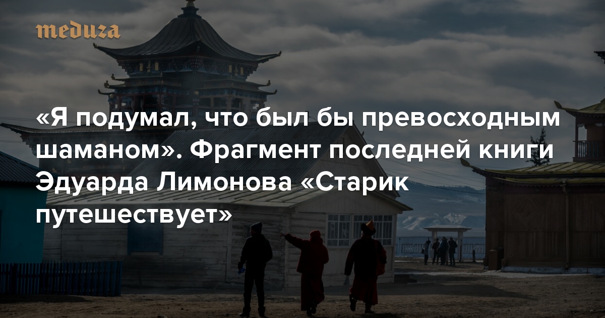 В издательстве Individuum (совместно с Bookmate Originals) выходит бумажная версия последней книги Эдуарда Лимонова «Старик путешествует», законченной им незадолго до смерти. Это сборник очерков писателя о детстве, жизни в Париже и Нью-Йорке и недавних поездках в Испанию, Монголию и другие страны. С разрешения издательства «Медуза» публикует фрагмент книги — о путешествии Лимонова по Бурятии. В тексте сохранена авторская пунктуация.