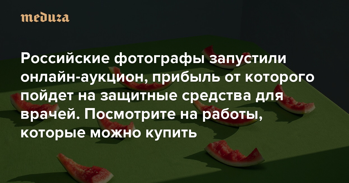 Академия «Фотографика» вместе с фондом «Живой» и проектом EverydayRussia запустила благотворительный онлайн-аукцион в поддержку российских врачей, который продлится до 10 мая. Вырученные деньги пойдут на закупку средств индивидуальной защиты (респираторы, маски, комбинезоны и т. д.). В аукционе участвуют 138 фотографов — «Медуза» публикует 14 представленных работ с комментариями авторов. Купить фотографии можно здесь.