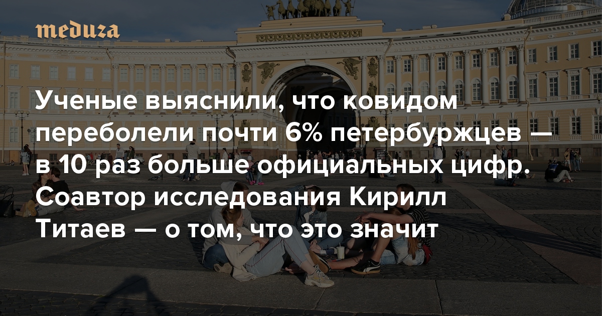 Европейский университет в Санкт-Петербурге и сеть клиник «Скандинавия» провели исследование для оценки числа жителей города, переболевших коронавирусом. По предварительным данным, им заразилось не меньше 5,7% петербуржцев — это примерно в 10 раз больше официальных цифр в 24 тысячи заболевших. Много это или мало? Почему цифры превышают официальные и что это значит? Об этом «Медуза» поговорила с одним из авторов исследования, социологом Кириллом Титаевым.