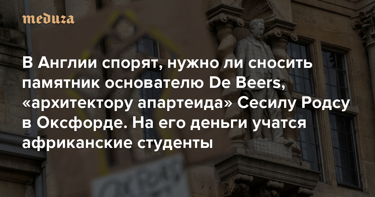 В Англии спорят, нужно ли сносить памятник основателю De Beers, «архитектору апартеида» Сесилу Родсу в Оксфорде Дискуссия дошла и до России