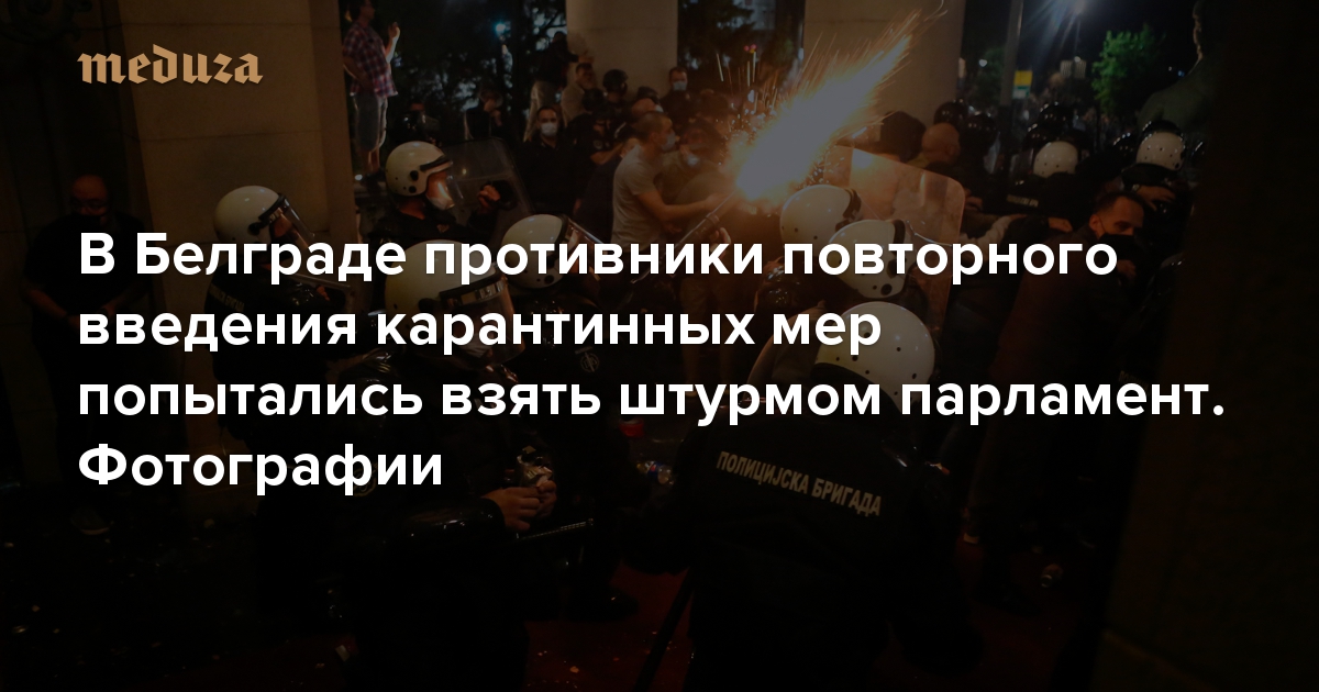 В ночь на 8 июля в столице Сербии прошла стихийная акция протеста против введения повторных ограничительных мер из-за распространения коронавируса. Жители Белграда вышли на улицы и попытались взять штурмом здание сербского парламента — Национальной скупщины. Граждане, недовольные планами властей о введении комендантского часа из-за COVID-19, потребовали отставки президента Сербии Александра Вучича, вступив в столкновения с полицией — протестующие закидывали полицейских камнями и бутылками, те в ответ применили слезоточивый газ. В результате пострадали 60 человек — 43 сотрудника полиции и 17 протестующих. Более 20 зачинщиков беспорядков задержаны.