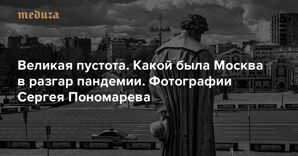 В Музее Москвы 17 июля открывается выставка фотожурналиста и обладателя Пулитцеровской премии Сергея Пономарева «Москва. Великая пустота», на которой можно будет увидеть серию из 45 черно-белых панорамных снимков пустой столицы — их Пономарев сделал во время пандемии коронавируса и самоизоляции. «Медуза» публикует несколько работ с комментариями автора.