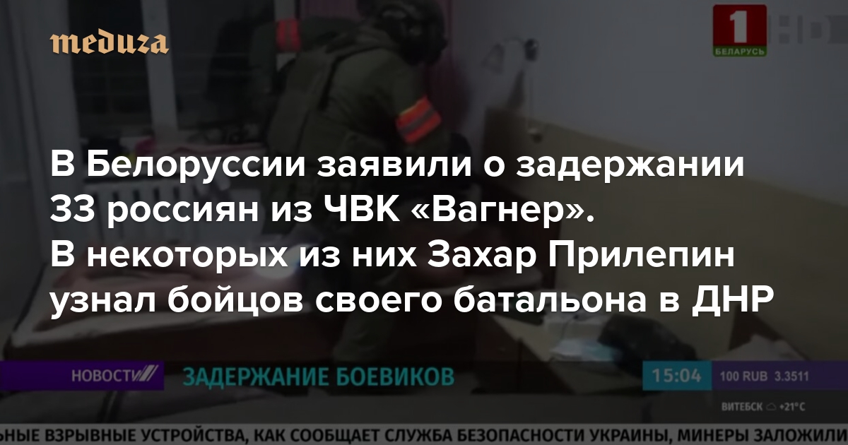 В Белорусии задержаны 33 боевика российской ЧВК «Вагнер», сообщило государственное информагенство «Белта». Белорусские правоохранительные органы получили сведения о прибытии в страну более 200 боевиков «для дестабилизации обстановки в период избирательной кампании», пишет агентство. Они приехали в Минск 25 июля, прожили два дня в гостинице и переселились в санаторий под Минском. Там ночью 29 июля КГБ и минский ОМОН задержали 32 человека. 33-й был задержан на юге Белоруссии. «Белта» назвала задержанных россиянами и опубликовала их имена, фамилии и даты рождения (как отмечает Tut.by, некоторые из имен фигурируют в списках ЧВК «Вагнер», опубликованных в СМИ). Глава КГБ Белоруссии Валерий Вакульчик подтвердил, что задержанные граждане РФ являются членами «частной военной компании Вагнера». В посольстве РФ в Минске сообщили, что получили от главного консульского управления МИД Белоруссии уведомление о задержании 32 граждан России. Кадры задержания предполагаемых боевиков показал государственный канал «Беларусь 1».