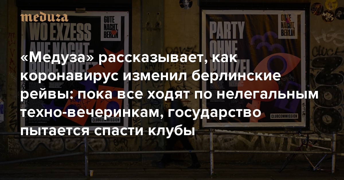 Вечеринка закончилась, жуки в парке тоже хотят спать «Медуза» рассказывает, как коронавирус изменил берлинские рейвы: пока все ходят по нелегальным техно-вечеринкам, государство пытается спасти клубы