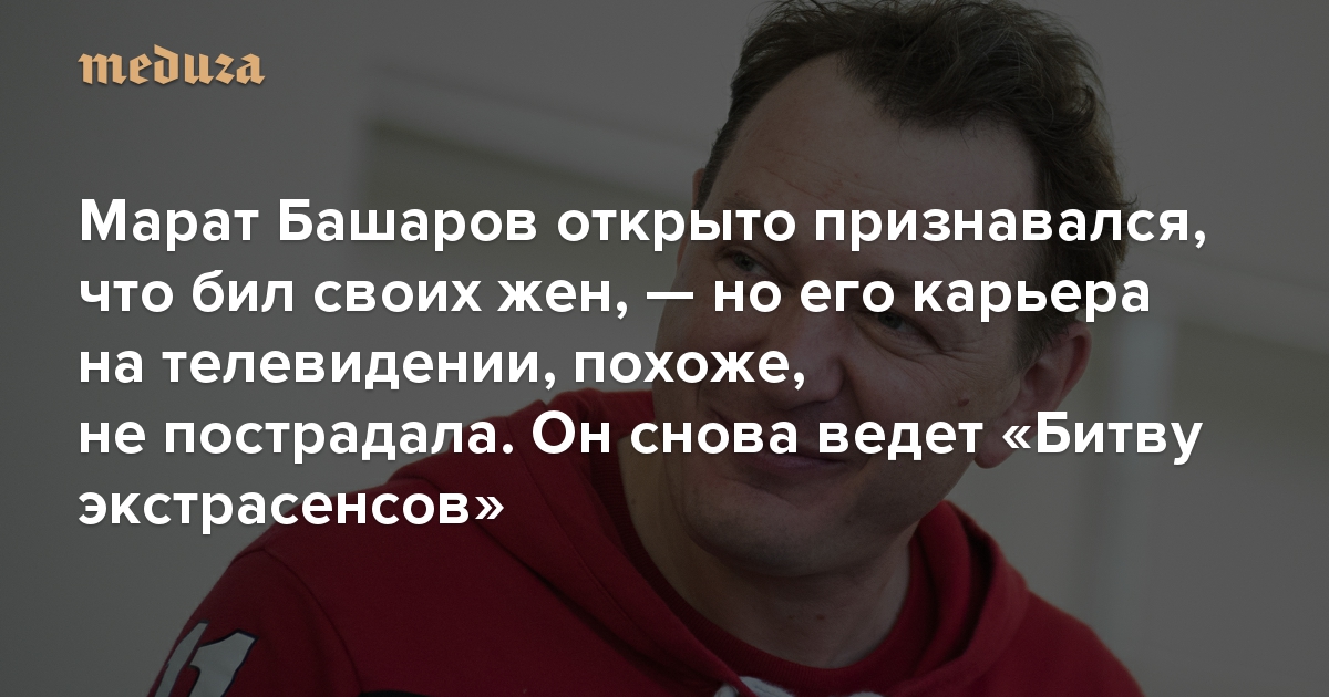 Весной 2020 года актер и телеведущий Марат Башаров дважды публично признался, что избивал бывших жен. Но, похоже, это не помешало его карьере на телевидении. 26 сентября на ТНТ стартовал 21-й сезон шоу «Битва экстрасенсов» — Башаров продолжает вести его. Продюсер шоу в разговоре с «Медузой» уверяет, что актер исправился. Одна из его бывших жен в этом сомневается, а депутат Оксана Пушкина, соавтор законопроекта о домашнем насилии, считает, что случай Башарова — плохой пример для других абьюзеров, которые тоже могут остаться безнаказанными.