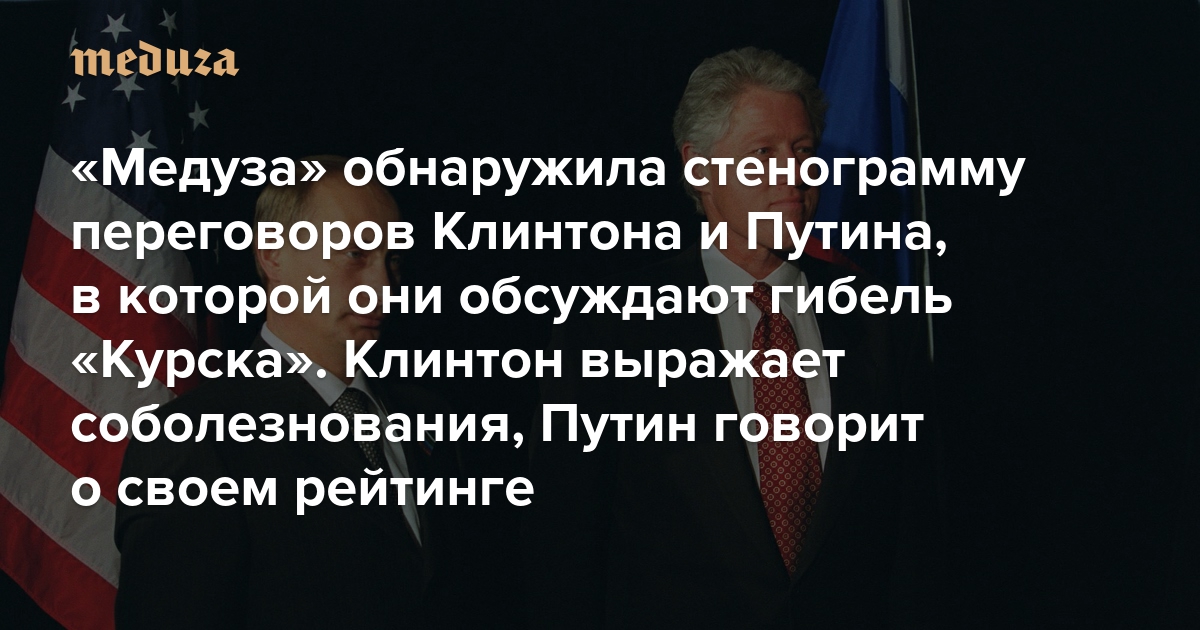 «Медуза» обнаружила стенограмму переговоров Клинтона и Путина, в которой они обсуждают гибель «Курска». Клинтон выражает соболезнования, Путин говорит о своем рейтинге