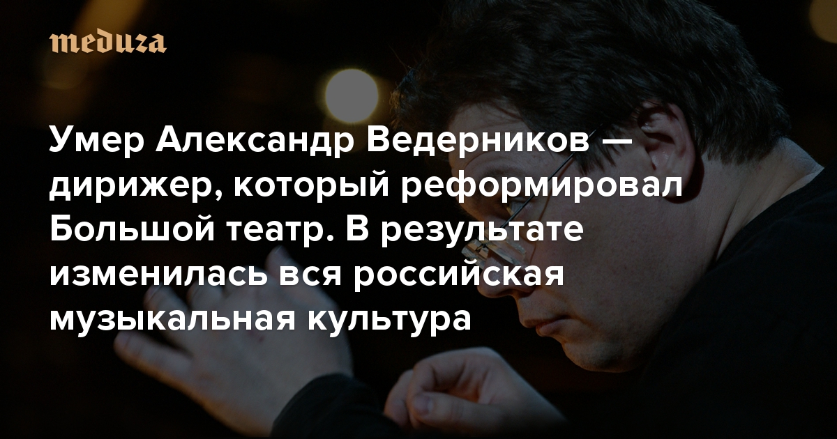 29 октября в Москве на 57 году жизни от коронавируса умер дирижер Александр Ведерников. С 2001 по 2009 год он был музыкальным руководителем Большого театра, а после отставки сделал блестящую международную карьеру. Последние десять лет он почти не выступал в России — даже после того, как в 2019 году стал главным дирижером Михайловского театра. По просьбе «Медузы» музыкальный критик Дмитрий Ренанский рассказывает, почему в новейшую историю российской культуры Александр Ведерников войдет одной из самых важных и самых парадоксальных ее фигур.