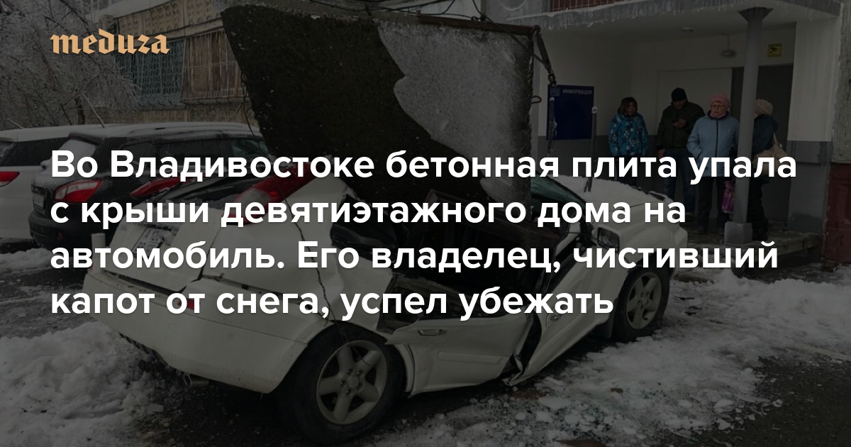 Во Владивостоке бетонная плита упала с крыши девятиэтажного дома на автомобиль. Его владелец, чистивший капот от снега, успел убежать Он купил машину всего две недели назад