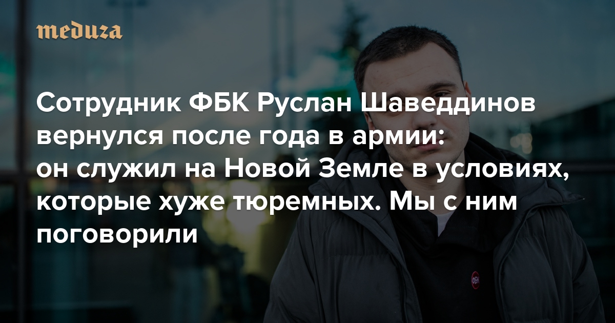 «Я стал еще более злым на всех наших врагов» Сотрудник ФБК Руслан Шаведдинов вернулся после года в армии: он служил на Новой Земле в условиях, которые хуже тюремных. Мы с ним поговорили