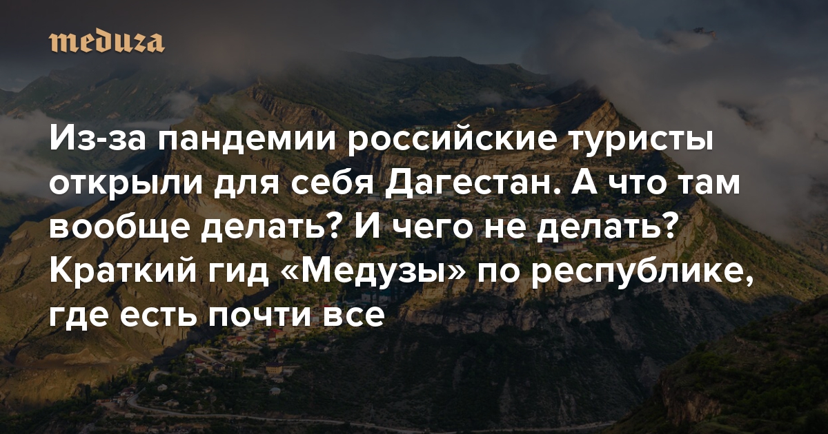 Глава Ростуризма Зарина Догузова, подводя недавно итоги 2020 года, признала, что после закрытия границ из-за коронавируса бума туризма внутри страны не случилось — в целом поток туристов в российских регионах сократился. Но в некоторые места люди ехали очень активно, отметила Догузова: «Дагестан пользовался большой популярностью», — в числе прочего сообщила она. Действительно, в 2020 году в эту республику поехали отдыхать даже те, кто вообще никогда не считал ее туристической локацией. «Медуза» попросила журналиста Владимира Севриновского, который постоянно пишет о Кавказе и отлично в нем разбирается, составить краткий гид по Дагестану — как, когда и куда ехать, что там делать, что есть и что покупать.