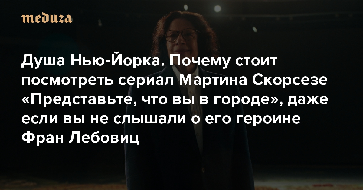 Фран Лебовиц — писательница, публицист и юморист, которая уже полвека беспощадно, точно и ехидно, но с неизменной любовью комментирует жизнь в Нью-Йорке. Ее можно, по аналогии с Жванецким, назвать «дежурным по городу». В сериале Мартина Скорсезе эта мысль обыгрывается уже в конце первого эпизода: после титров Лебовиц нажимает на выключатель — и повсюду гаснет свет. Можно ее высокопарно назвать и ангелом-хранителем Нью-Йорка или как минимум его духа.