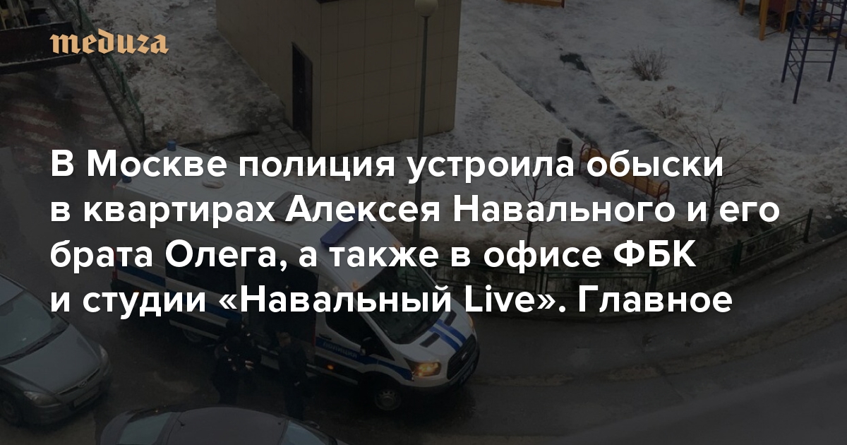 В Москве пришли с обысками в квартиры Навальных: в квартиру в Марьино, где живет Олег Навальный, а также в квартиру возле станции метро Автозаводская — там живут Алексей и Юлия Навальные. Телеграм-канал «Автозак Live» также написал, что к квартире в Марьино пришли сотрудники телеканалов РЕН ТВ, НТВ и «Россия 1». В съемную квартиру Алексея и Юлии Навальных на Автозаводской силовики выломали дверь. Они отказались пустить к Юлии адвоката, сообщил «Дождь». Также сотрудники правоохранительных органов заклеили скотчем дверной глазок и камеры видеонаблюдения.